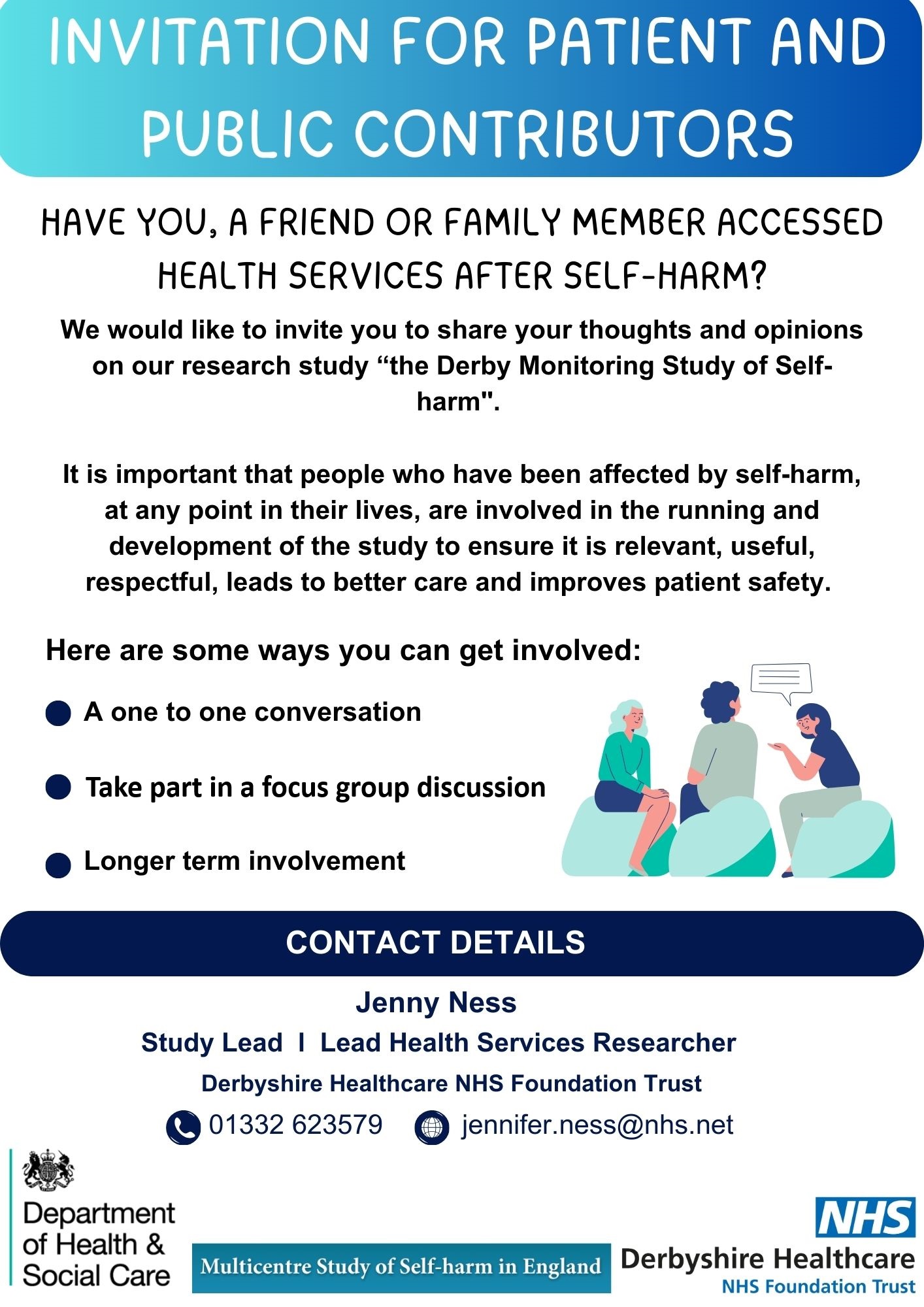 Have you, a friend or family member accessed health services after self-harm? We would like to invite you to share your thoughts and opinions on our research study "the Derby Monitoring Study of Self-harm". For more details, please see our PPI flyer.